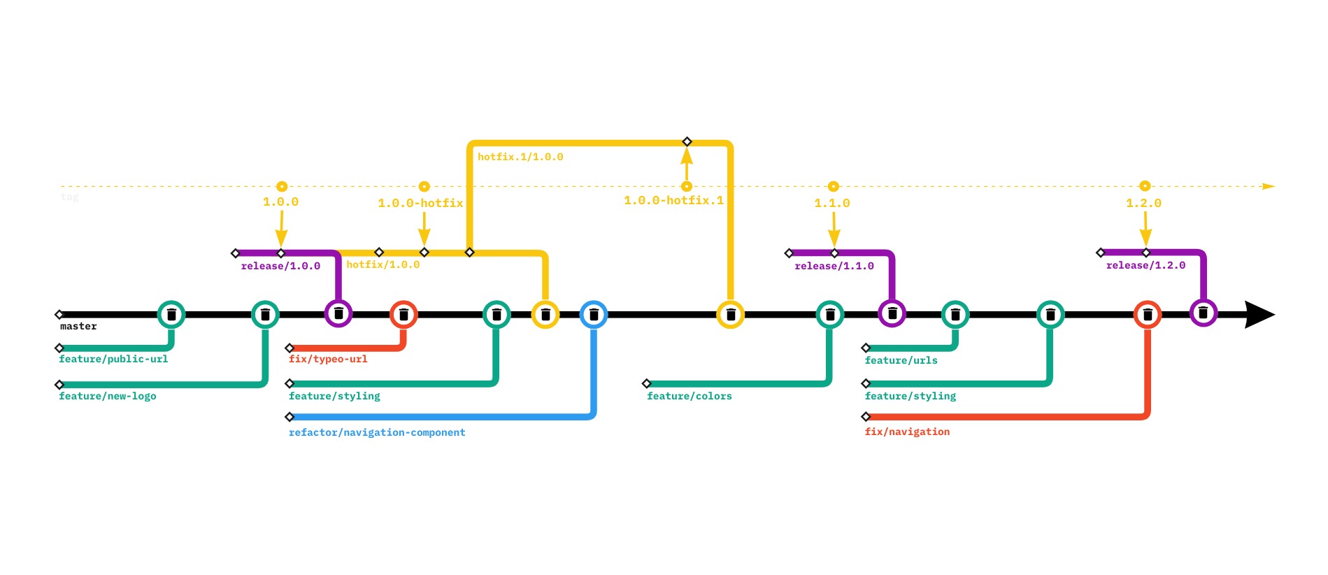 Like GitFlow but simpler, for fast paced teams where versioning and continuos deployment is important.